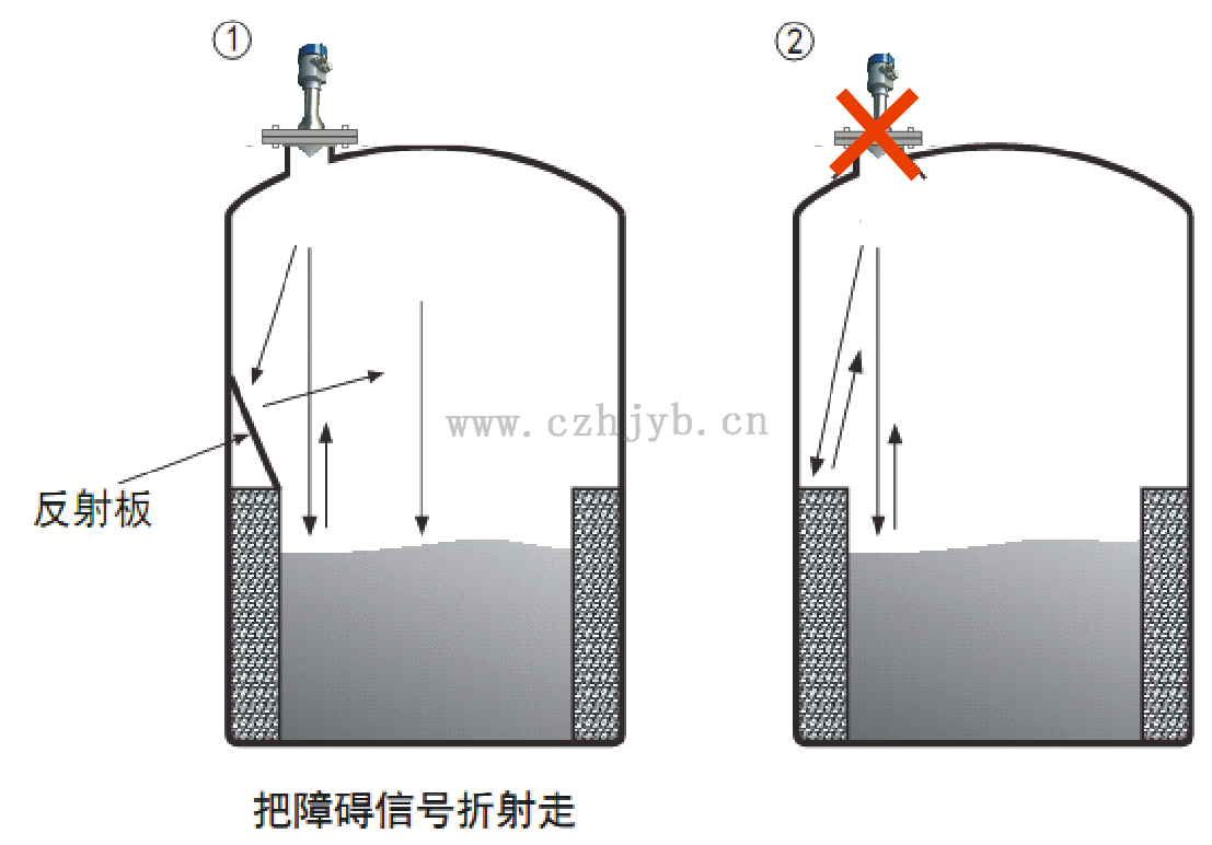 Ø 當罐中有障礙物影響測量時,要加裝反射板才能正常測量。